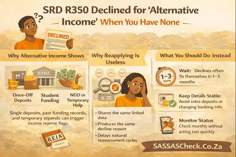 Few SASSA Status Check messages create more anger and confusion than seeing your SRD R370 application declined for “alternative income source” when you genuinely have no job, no salary, and no regular income. Unfortunately, most explanations online oversimplify the problem and quietly suggest that applicants are at fault.